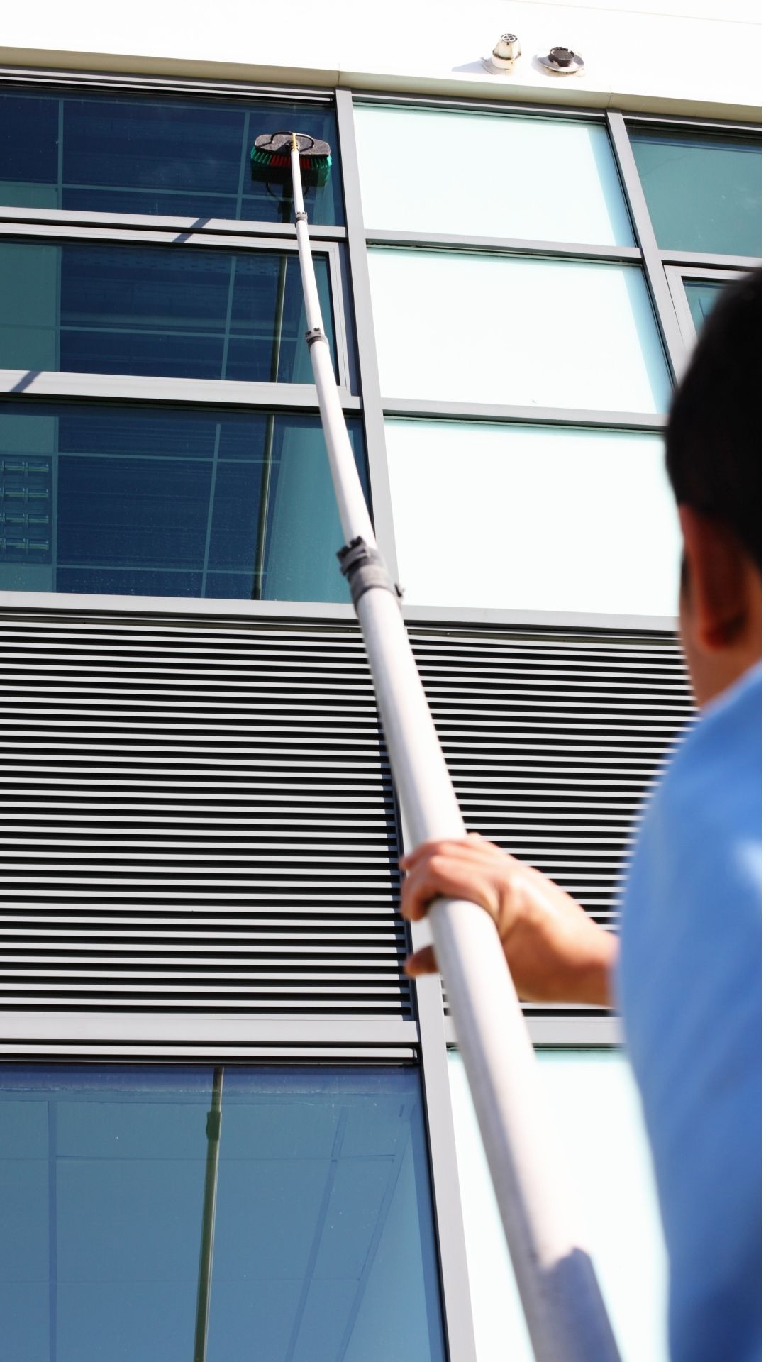 Egal wie hoch, mit unserem flexiblen Teleskopsystem können wir Ihre Fassade bis zu einer Höhe von 22 Metern von Staub und Schmutz befreien.